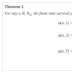 \[ W(t)=u+2t-{\sum \limits_{i=1}^{t}}{X_{i}}-{\sum \limits_{j=1}^{\lfloor t/2\rfloor }}{Y_{j}},\]The probability (2) is called the finite time survival probability while the later one (3) is the ultimate time survival probability and they both deal with the possibility that $W(t)>0$ for all $t\in \{1,\hspace{0.1667em}\dots ,\hspace{0.1667em}T\}$, when T is finite or $T\to \infty $. The ultimate time survival probability (3) heavily depends on the net profit condition, which for the model (1), is defined as