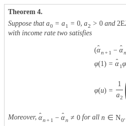 \[\begin{aligned}{}& ({\hat{\alpha }_{n+1}}-{\hat{\alpha }_{n}})\varphi (0)+({\hat{\delta }_{n+1}}-{\hat{\delta }_{n}})(4-2\mathbb{E}X-\mathbb{E}Y)=\varphi (n+1)-\varphi (n),\hspace{0.1667em}n\in {\mathbb{N}_{0}},\\ {} & \varphi (1)={\hat{\alpha }_{1}}\varphi (0)+{\hat{\delta }_{1}}(4-2\mathbb{E}X-\mathbb{E}Y),\\ {} & \varphi (u)=\frac{1}{{a_{2}}}\left(\varphi (u-2)-{\sum \limits_{k=1}^{u-1}}{a_{u+2-k}}\varphi (k)+{x_{u}}{s_{1}}\varphi (1)\right),\hspace{0.1667em}u=2,\hspace{0.1667em}3,\hspace{0.1667em}\dots \end{aligned}\]