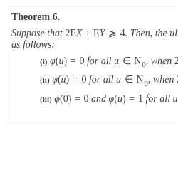 (i) $\varphi (u)=0$ for all $u\in {\mathbb{N}_{0}}$, when $2\mathbb{E}X+\mathbb{E}Y>4$,