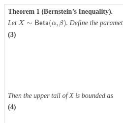 • The work [10] gives bounds with explicit but suboptimal v and c, only valid in a limited range of deviations $\sqrt{\frac{6\alpha }{{(\alpha +\beta )^{2}}}}<\epsilon <\frac{\alpha }{\alpha +\beta }$.The proof relies on specific integral estimates, and cannot be sharpened much.