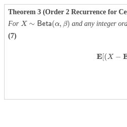 • Useful recursion for central moments of the Beta distribution: it is of order 2 with coefficients linearly dependent on the moment order. This formula addresses the lack of a simple closed-form formula for higher-order moments. We use it to estimate the moment generating function.