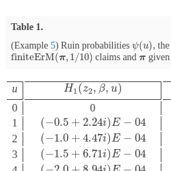 Observe again that the first term ${b_{1}}$ is positive and is much more significant than any of the other entries of b. As ${z_{3}}$ and ${z_{4}}$ are complex conjugates, their associated values ${b_{3,1}}$, ${b_{3,2}}$ and ${b_{4,1}}$, ${b_{4,2}}$ are also complex conjugates, respectively. By Theorem 1, the ruin probability reads