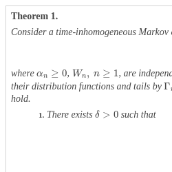 where ${\alpha _{n}}\ge 0$, ${W_{n}},\hspace{2.5pt}n\ge 1$, are independent and centered random variables defined on the same probability space $(\Omega ,ℱ,\mathbb{P})$. Denote their distribution functions and tails by ${\Gamma _{n}}(x)$ and ${\bar{\Gamma }_{n}}(x)=1-{\Gamma _{n}}(x)={\textstyle\int _{x}^{\infty }}{\Gamma _{n}}(dy)$, respectively. Assume the following conditions hold.