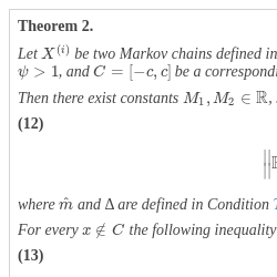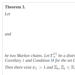 \[ \begin{array}{l}{\Gamma _{n}^{(1)}}=(1-\tilde{\varepsilon }){\Gamma _{n}}+\tilde{\varepsilon }{R_{n}^{(1)}},\\ {} {\Gamma _{n}^{(2)}}=(1-\tilde{\varepsilon }){\Gamma _{n}}+\tilde{\varepsilon }{R_{n}^{(2)}},\end{array}\]Our goal is to find conditions which ensure proximity of n-steps transition probabilities for all n, given only one-step proximity. Additionally, we want to demonstrate that such proximity is approximately of order ε, and all involved constants can be calculated in practical applications.