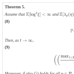 Note that (5) implies $\mathbb{E}[{\lambda _{p}}(\eta )]\lt \infty $ and (6) implies $\mathbb{E}[\log \eta ]\lt \infty $. Theorem 5 below tells us that under such moment conditions and assuming also $\mathbb{E}[{\log ^{2}}\xi ]\lt \infty $ the maxima ${\max _{1\le k\le n}}\hspace{0.1667em}{T_{k}}(p)$, $p\in \mathcal{P}$, of noncentered perturbed random walks $T(p)$ have the same behavior as ${S_{n}}(p)$, $p\in \mathcal{P}$ as $n\to \infty $.