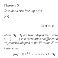 where ${B_{1}},{B_{2}}$ are two independent Brownian motions, $X=\{X(t),t\in [0,T]\}$ denotes the (risk-free) log-price of an asset starting from some level ${x_{0}}\in \mathbb{R}$, r is a constant instantaneous interest rate, and $\rho \in (-1,1)$ is a correlation coefficient that accounts for the leverage effect. As previously, the drift b and the Volterra kernel $\mathcal{K}$ satisfy Assumptions 1 and 2.
