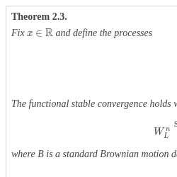 \[ {W_{L}^{n}}\stackrel{\mathrm{Stably}}{\to }{k_{L}}{\int _{0}^{\cdot }}\sqrt{{L_{s}}(x)}B(ds),\hspace{2em}{W_{O}^{n}}\stackrel{\mathrm{Stably}}{\to }{k_{O}}{\int _{0}^{\cdot }}\sqrt{{L_{s}}(x)}B(ds),\]