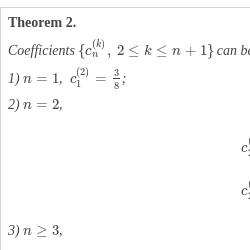 1) If $n=1$, then $k=2$ and we have one equation ${c_{1}^{(2)}}\mathsf{E}{\Delta _{2}^{2}}=\mathsf{E}{\Delta _{1}}{\Delta _{2}}$. By (10) and (11) we obtain ${c_{1}^{(2)}}\frac{4}{3}=\frac{1}{2}$, and ${c_{1}^{(2)}}=\frac{3}{8}$.