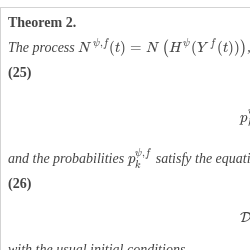 \[ {p_{k}^{\psi ,f}}(t)=\mathsf{P}\left\{N\left({H^{\psi }}({Y^{f}}(t))\right)=k\right\}={\int _{0}^{\infty }}{p_{k}^{\psi }}(u){\ell _{f}}(t,u)du,\hspace{1em}k=0,1,2,\dots .\]