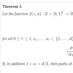 for some constant ${C_{f}}\gt 0$, which is independent of z, and all $0\le r\le l$, ${s_{1}},\dots ,{s_{r}}\subset \{1,\dots ,d\}$. Moreover, let l-th derivatives be Hölder continuous with an exponent $\alpha \gt 0$, i. e.