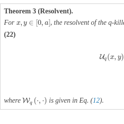 \[ {\mathbb{E}_{x}}\Big({v^{{\tau _{a}^{+}}}}{\mathbf{1}_{({\tau _{a}^{+}}\lt {\tau _{-1}^{-}})}}\Big)=\frac{{W_{v}}\left(x\right)}{{W_{v}}\left(a\right)},\](3)