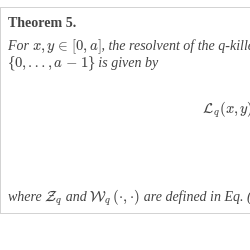 \[\begin{aligned}{}{\mathcal{U}_{q}}(x,y,z)& :={\sum \limits_{n=0}^{\infty }}{\mathbb{E}_{x}}\left[{\prod \limits_{i=1}^{n}}q({X_{i}}){\mathbf{1}_{({X_{n}}=y,\hspace{0.2778em}n\lt {\tau _{z-1}^{-}}\wedge {\tau _{a}^{+}})}}\right]\\ {} & =q{(y+1)^{-1}}\left(\frac{{\mathcal{W}_{q}}\left(a,y+1\right){\mathcal{W}_{q}}\left(x,z\right)}{{\mathcal{W}_{q}}\left(a,z\right)}-{\mathcal{W}_{q}}\left(x,y+1\right)\right),\end{aligned}\]3.4 Exit times for reflected processes