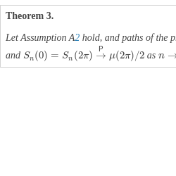 Let Assumption A2 hold, and paths of the process $\mu (t)$, $0\le t\le 2\pi $, be continuous. Then for any $t\in (0,2\pi )$ it holds that ${S_{n}}(t)\stackrel{\mathsf{P}}{\to }\mu (t)$ and ${S_{n}}(0)={S_{n}}(2\pi )\stackrel{\mathsf{P}}{\to }\mu (2\pi )/2$ as $n\to \infty $.