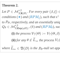 (i) for every pair $(\rho ,Q)\in {\mathfrak{M}_{+}}(D)\times {\mathcal{M}_{S,\mathbf{Exp}(\rho (\varTheta ))}^{\ast ,\ell }}$ there exists an essentially unique pair $(\beta ,\xi )\in {\mathcal{F}_{P,\varTheta }^{\ell }}\times {\mathcal{R}_{+}^{\ast ,\ell }}(D)$, where ${e^{\gamma }}$ and ξ are the Radon–Nikodým derivatives of ${Q_{{X_{1}}}}$ with respect to ${P_{{X_{1}}}}$ and of ${Q_{\varTheta }}$ with respect to ${P_{\varTheta }}$, respectively, satisfying conditions (∗) and ($RP{M_{\xi }}$);