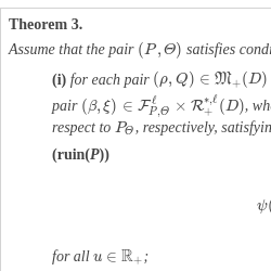 ($ruin(P)$): The formula for the ruin probability $\psi (u)$ of the reserve process ${R^{u}}(\varTheta )$, i.e.,\[\begin{aligned}{}& \psi (u)=\int \frac{1}{\xi (\varTheta )}\cdot {e^{-{S_{{T_{u}}(\varTheta )}^{(\gamma )}}}}\cdot {\prod \limits_{j=1}^{{N_{{T_{u}}(\varTheta )}}}}\frac{d\mathbf{K}(\varTheta )}{d\mathbf{Exp}(\rho (\varTheta ))}({W_{j}})\hspace{0.1667em}dQ\lt 1\\ {} & \hspace{1em}\text{for any}\hspace{2.5pt}u\in {\mathbb{R}_{+}},\end{aligned}\]see Theorem 3(i);