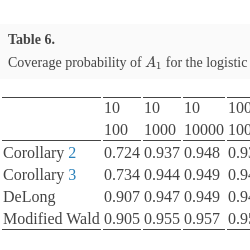 where ${\beta _{0}}$ is the true parameter. For each parameter combination we determined the coverage probability for ${A_{1}}$, the coverage probability for ${A_{2}}$ and the mean length of the confidence intervals based on 10,000 simulation runs. For simulating the true value of ${A_{2}}$ we generated a sample of ${10^{8}}$ observations and for simulating the true value of ${A_{1}}$ we generated in each simulation run a sample of ${10^{6}}$ observations. The results are reported in Tables 3–8.Table 3.