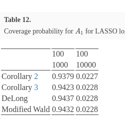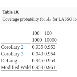 While the theoretical results tell that asymptotically the old confidence intervals work under Model 2 as well, our simulation results tell that at small sample size these confidence intervals may have a seriously too low coverage probability—recall in particular the results in Table 4 for $p=100$. Hence the construction of new confidence intervals is desirable. A tempting idea is to use the δ-method in the same way as we use it in the proof. However, the derivative in Lemma 3 is zero and hence one will end up with the old confidence intervals when using this approach. A solution would be to use the second-order δ-method (see, e.g., [1, Lemma 5]). However, this may appear to be inelegant. The second-order δ-method yields that the limiting distribution of the AUC is a sum of squares of Gaussian random variables, but since not all Gaussian random variables involved in that sum have the same variance, this sum will not be ${\chi ^{2}}$-distributed in general. It is not clear whether a closed-form expression for the variances of these Gaussian random variables can be derived even in the ideal situation when the design points are multivariate-normally distributed or distributed uniformly on the ball. In the realistic situation, when the distribution of the design points is unknown and has to be estimated, it will even be a challenge to propose an algorithm that gives a reasonable approximation for these variances in acceptable time. The results for the LASSO logistic regression ranged from providing a satisfactory solution to being even worse than the pure logistic regression depending on the unknown true model parameter. Bootstrap [3] is known to have good finite-sample properties in many instances and hence would be another approach worth trying. Finally, our simulations in Table 16 show that the estimator $\hat{A}$ is seriously biased for ${A_{2}}$. Hence one can think of constructing an estimator for the bias of $\hat{A}$ for ${A_{2}}$ and then applying bias reduction.