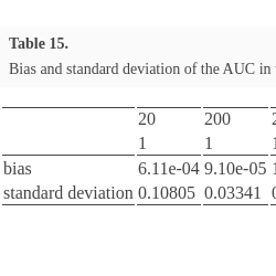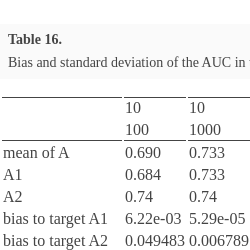 It is a natural question, whether these confidence intervals can be further improved by bias reduction. In order to assess that, we investigated the bias and the standard deviation under the model assumptions explained above. The results are reported in Table 15 and Table 16. We see that, while the bias in the binormal model and the bias to the target ${A_{1}}$ in the logistic regression model are neglectable, there is a considerable bias to ${A_{2}}$ in the logistic regression model.