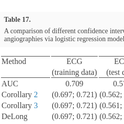 The results are reported in Table 17. Though strictly speaking outside the scope of this article, we added the results for the training group. In order to see how the confidence intervals behave on a smaller sample, we applied our methods to a subsample consisting of 100 coronary angiographies. The results are shown in Table 18.