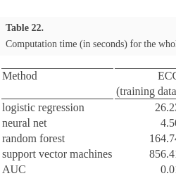In order to evaluate the computation times for the confidence intervals, observe that their computation is a two-step procedure. First, the chosen model estimator is used to calculate the fitted values ${\hat{Y}_{2,i}}$, $i=1,\dots ,n$, and in the second step the confidence intervals are calculated from these numbers. So the total computation time of a confidence interval is the sum of one component which does depend on the model estimator, but not on the confidence interval method, and one component which does depend on the confidence interval method, but not on the model estimator. The computation times are reported in Table 22 and Table 23. We see that the computation times for the new intervals are longer than for those from the literature, but that also the computation of the new confidence intervals is feasible. In particular, for random forests and support vector machines the difference between the new computation times and the old ones is neglectable compared to the time needed for the calculation of the fitted values ${\hat{Y}_{2,i}}$, $i=1,\dots ,n$, anyway.