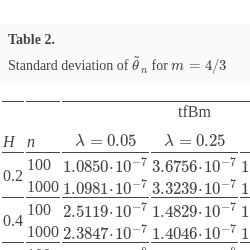 For equation (22), we fixed the parameters $\theta =2$ and $\sigma =1$. For each type of tempered fractional Brownian motion (tfBm and tfBmII), we considered 18 combinations of parameters, with $\lambda \in \{0.05,0.25,0.5\}$ and $H\in \{0.2,0.4,0.6,0.8,1.2,1.4\}$.