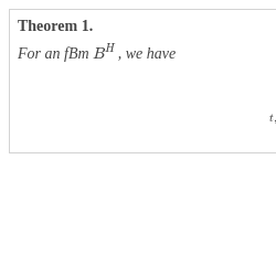 for $s<t$ follows from the results of [10].Finally, it is worth to add that for $f\in {C}^{\gamma }[0,1]$ with $\gamma >1-H$, the extended fractional integral is well defined since the derivative ${D_{0+}^{\alpha }}f$ is bounded for any $\alpha <\gamma $, and thus we can take $\alpha \in (1-H,\gamma )$ in the definition. The value of the integral agrees with the so-called Young integral, which is given by a limit of integral sums. An important example is $f(x)=g({B}^{H}(x))$ where g is Lipschitz continuous. In this case, the following change-of-variable formula holds: