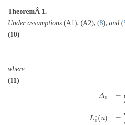 \[\begin{array}{r@{\hskip0pt}l}& \displaystyle \hat{\varDelta }=a_{n}+\frac{\varDelta _{n}}{b_{n}},\\{} & \displaystyle \varDelta _{n}\stackrel{D}{\longrightarrow }\varDelta _{0}\hspace{1em}as\hspace{2.5pt}n\to \infty .\end{array}\]