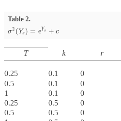 3. For each combination of input parameters we generate 1000 trajectories of an Ornstein–Uhlenbeck process by splitting the time interval into subintervals of length $\Delta t=0.001$ and modeling values of the OU process at these points (that is, generating normally distributed variables with known mean and standard deviation using relationship (6)). For each trajectory, (10) is applied to calculate ${\bar{\sigma }_{m}^{2}}$ and the price of an option. The results for all trajectories are then averaged and discounted to provide the sample average of the price denoted by $\hat{\mathbb{E}}\hat{P}_{m}$. The average volatility over all trajectories and time interval is denoted by $\hat{\mathbb{E}}{\bar{\sigma }_{m}^{2}}$.