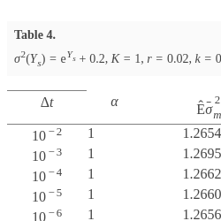 | $\Delta t$ | α | $\hat{\mathbb{E}}{\bar{\sigma }_{m}^{2}}$ | ${\bar{d}_{1}^{(m)}}$ | ${\bar{d}_{2}^{(m)}}$ | $\hat{\mathbb{E}}\hat{P}_{m}$ |