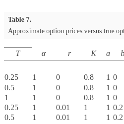 | T | α | r | K | a | b | $\hat{\mathbb{E}}\hat{P}_{m}$ | $\mathbb{E}V$ | $\hat{\mathbb{E}}\hat{P}_{m}$ | $\mathbb{E}V$ |