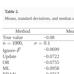 Note that standard errors for coverage probability are $1.3\% $ for 80% confidence ellipsoids and $0.7\% $ for 95% confidence ellipsoids. The simulations do not allow us to make an inference which estimator is better. Thus, $\widehat{\varSigma }_{\mathrm{sample}}$-based estimator updated before ignore-$\widehat{F}$ step is compared with other estimators in simulations in Section 4.4 because of simpler explicit expression for $\widehat{\varSigma }_{\mathrm{sample}}$.