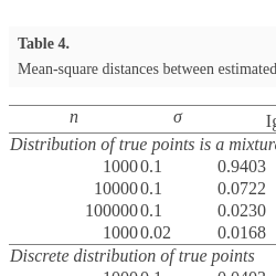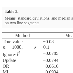 Mean-square deviance of the intersection of the estimated lines from the true intersection point is presented in Table 4.