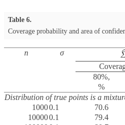 The sample coverage probability and median (over 1000 ellipsoids) area of the confidence ellipsoids is presented in Table 6. The ellipsoids were constructed for confidence levels 0.8 and 0.95. The area of 95% confidence ellipsoids is displayed in Table 6, and the area of 80% confidence ellipsoid is $\log _{20}(5)=0.5372$ of the area of 95% confidence ellipsoids.