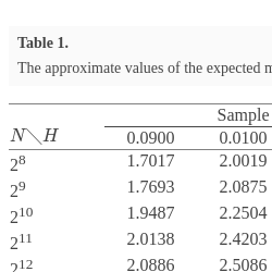| ${(2\sqrt{H\pi e\ln 2})}^{-1}$ | 0.5811 | 1.3696 | 4.1089 | 11.396 | 41.089 | ||