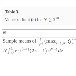 The integrand in (11) is not an elementary function, but its values are tabulated, and there exist methods for its numerical computing. For the present paper, the integral $N{\int _{0.5}^{1}}{\mathrm{erf}}^{(-1)}(2z-1){z}^{N-1}dz$ is calculated numerically, and the corresponding values are presented in Tables 2 and 3. By maintaining the accuracy of calculations, the maximum possible value of N is 231, and the value of the integral reaches 4.390.