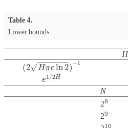 Moreover, the maximum of the right-hand side of (13) equals ${(4H\pi e\ln 2)}^{-1/2}$ and is reached when $N=[{e}^{1/2H}]$. The values of the lower bound are presented in Table 4.