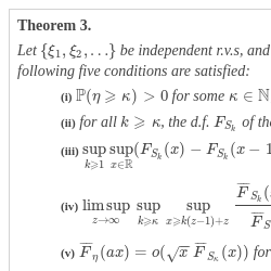 (iii) $\underset{k\geqslant 1}{\sup }\underset{x\in \mathbb{R}}{\sup }(F_{S_{k}}(x)-F_{S_{k}}(x-1))\sqrt{k}<\infty $;
