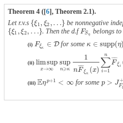 (e) $\underset{x\to \infty }{\limsup }\underset{n\geqslant 1}{\sup }\displaystyle\frac{1}{n\overline{F}_{\xi _{1}}(x)}{\displaystyle\sum \limits_{i=1}^{n}}\overline{F}_{\xi _{i}}(x)\leqslant 1$,