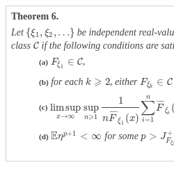 \[\begin{array}{r@{\hskip0pt}l}& \displaystyle \underset{x\to \infty }{\limsup }\hspace{0.1667em}\underset{n\geqslant 1}{\sup }\frac{1}{n\hspace{0.1667em}\mathbb{P}(\xi _{1}-\mathbb{E}\xi _{1}>x)}{\sum \limits_{k=1}^{n}}\mathbb{P}(\xi _{i}-\mathbb{E}\xi _{i}>x)<\infty \end{array}\]
