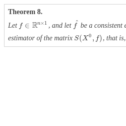 Let $f\in {\mathbb{R}}^{n\times 1}$, and let $\hat{f}$ be a consistent estimator of this vector. Under the conditions of Theorem 4, the statistic $\hat{S}(\hat{f})$ is a consistent estimator of the matrix $S({X}^{0},f)$, that is, $\hat{S}(\hat{f})\stackrel{\mathrm{P}}{\to }S({X}^{0},f)$.