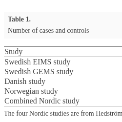 Multiple sclerosis (MS) is a complex and inflammatory disease causing damage to the central nervous system. Its prevalence is over 0.1% in many countries, affecting large regions of the world [21]. There is solid evidence for a genetic component of the disorder, with a major contribution from variants at the human leukocyte antigen (HLA) complex. It is also well known that presence of allele 15 of the HLA-DRB1 gene is a risk factor, whereas allele 02 of the HLA-A gene has a protective effect [7]. Several studies reveal that environmental factors, in particular smoking, impact the risk of the disease as well [22]. A Swedish study in Hedström et al. [13] demonstrated positive pairwise additive interaction between the two genetic factors, and also between smoking and each genetic factor. These results have more recently been replicated and refined in Hedström et al. [14], by merging case-control studies from several countries. Due to the size of this meta analysis, it was also possible to investigate whether third order interaction was present between the two genetic factors and smoking. In order to illustrate the methodology of this paper, we present some of the findings from the four Nordic studies (see Table 1) of Hedström et al. [14].