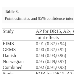 The estimates of Table 2 motivate further analysis of the MS datasets in Hedström et al [14] based on the attributable proportion, excess odds ratio and synergy index for the three risk factors DR15, A2- and smoking. Table 3 gives confidence intervals for all three quantities when $J=\{1,2,3\}$ and $K=\varnothing $, for various choices of i. It confirms a strong joint effect of all three factors, since AP and EOR are both significantly different from 0, and SI is significantly different from 1. For instance, the estimate $\widehat{\text{AP}}=0.92$ for the combined Nordic data set indicates that about 92% of the odds ratio (or disease risk) for smokers with both genetic risk factors, is not present among those that lack all three factors. We also find that the total amount of second and third order interaction between DR15, A2- and smoking is strongly significant. In particular, $\widehat{\text{AP}}=0.52$ for the Nordic metapopulation indicates that about half of the disease risk is due to interaction. One the other hand, $\widehat{\text{SI}}=2.38$ tells that the disease risk increment of a smoker with both genetic risk factors, compared to an individual with none of these risk factors, is more than twice the disease risk increment due to marginal effects only. Finally, we find from the rightmost AP, EOR and SI columns of Table 3 that third order interaction between DR15, A2- and smoking is only significant for one dataset (EIMS).