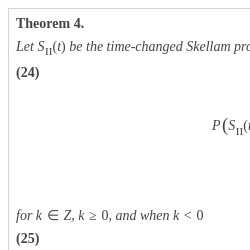 \[\begin{array}{r@{\hskip0pt}l}& \displaystyle s_{k}(t)=P\big(S(t)=k\big)={e}^{-t(\lambda _{1}+\lambda _{2})}{\bigg(\frac{\lambda _{1}}{\lambda _{2}}\bigg)}^{k/2}I_{|k|}(2t\sqrt{\lambda _{1}\lambda _{2}}),\\{} & \displaystyle \hspace{1em}k\in \mathbb{Z}=\{0,\pm 1,\pm 2,\dots \},\end{array}\]Skellam processes are considered, for example, in [2], the Skellam distribution had been introduced and studied in [19] and [9].