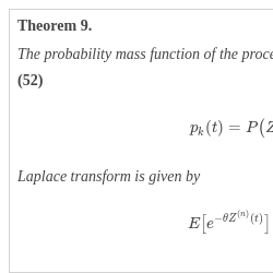\[\begin{array}{r@{\hskip0pt}l}\displaystyle \mathsf{E}{e}^{-\theta N_{1}(Y(t))}& \displaystyle ={\int _{0}^{\infty }}\mathsf{E}{e}^{-\theta N_{1}(t)}h(u,t)du=\mathsf{E}{e}^{-\lambda _{1}(1-{e}^{-\theta })Y(t)}\\{} & \displaystyle =\frac{\lambda }{\lambda +\lambda _{1}(1-{e}^{-\theta })\hspace{0.1667em}}\exp \bigg(-t\frac{\beta \lambda _{1}(1-{e}^{-\theta })}{\lambda +\lambda _{1}(1-{e}^{-\theta })}\bigg).\hspace{40.0pt}\end{array}\]