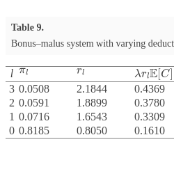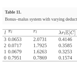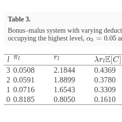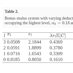Bonus–malus systems with varying deductibles are introduced by Pitrebois, Denuit and Walhin [17]. Specifically, the a posteriori premium correction induced by the bonus–malus system is replaced by a deductible (in whole or in part). To each level of the bonus–malus system in the malus zone is assigned an amount of deductible, which is applied to the claims filed during the coverage period either annually or claim by claim. Relative premiums at high levels of bonus–malus systems are often very large and the systems can be softened by introducing deductibles. The insurance company compensates the reduced penalties in the malus zone with the deductibles paid by policyholders who report claims being in the malus zone. This can be commercially attractive since the policyholders are penalized only if they report claims in the future.