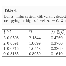Another approach that takes into account claim amounts is proposed by Bonsdorff [1]. The author considers a general framework for a bonus–malus system based on the number of claims during the previous year and the total amount of claims during the previous year. The set of the bonus levels is some interval and the transitions between the levels are determined by these characteristics.