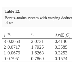 We denote by $r_{l}$ the premium relativities associated with level l. The meaning is that a policyholder occupying level l pays the premium equal to $\lambda r_{l}\mathbb{E}[C]$. Note that here and below we consider only net premiums. In what follows, we assume that $\mathbb{E}[C]<\infty $ and the distribution function $F_{C}$ of C is continuous.