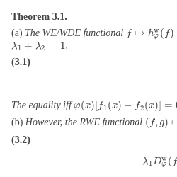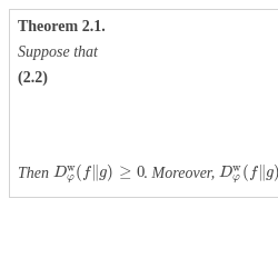 \[{D_{\varphi }^{\mathrm{w}}}(f\| g)=\int _{\mathcal{X}}\varphi (\mathbf{x})f(\mathbf{x})\log \frac{f(\mathbf{x})}{g(\mathbf{x})}\mathrm{d}\mu (\mathbf{x}).\]Theorem 2.1.
