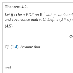 Let $f(\mathbf{x})$ be a PDF on ${\mathbb{R}}^{d}$ with mean $\mathbf{0}$ and $(d\times d)$ covariance matrix C. Let ${f}^{\mathrm{No}}(\mathbf{x})$ stand for the Gaussian PDF, again with the mean $\mathbf{0}$ and covariance matrix C. Define $(d\times d)$ matrices