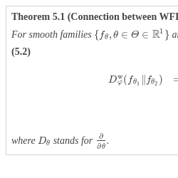 \[{J_{\varphi }^{\mathrm{w}}}(f_{\underline{\theta }})={J_{\varphi }^{\mathrm{w}}}(\mathbf{X},\underline{\theta })=\mathbb{E}\big[\varphi (\mathbf{X})S(\mathbf{X};\underline{\theta }){S}^{T}(\mathbf{X};\underline{\theta })\big].\]Theorem 5.1 (Connection between WFIM and weighted KL-divergence measures).